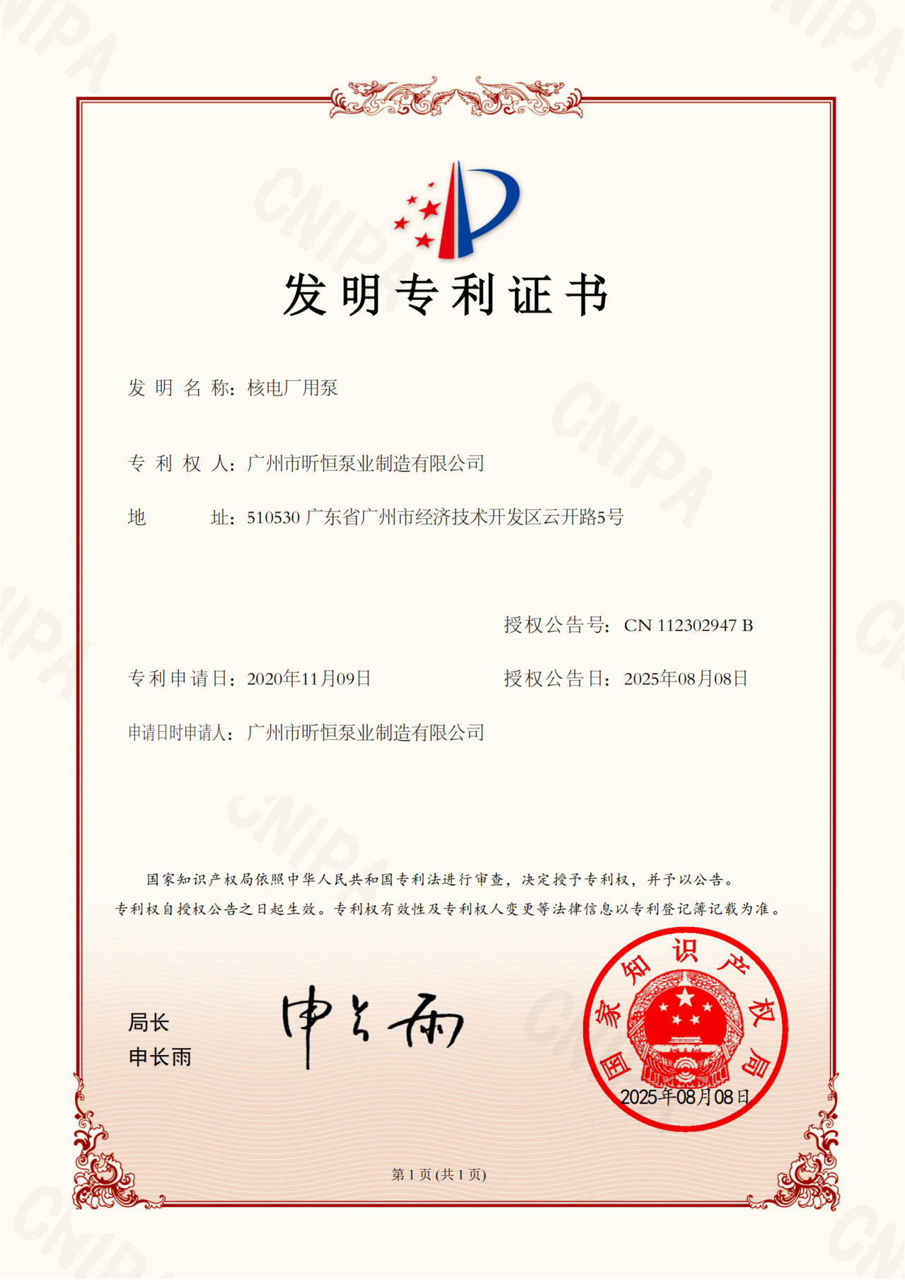 2025年8月8日,我司的"核電廠用泵"及"核電廠用泵組"兩項技術正式獲得國家知識產權局發明專利授權。此次專利授權是我司在核電裝備領域技術創新的重要突破,進一步夯實在專業泵領域的技術基礎。